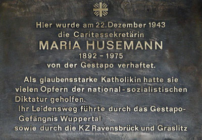 Nach Verhaftung des Wuppertaler Caritasleiters und Priesters Hans Carls durch das NS-Regime führte Maria Husemann seine Arbeit unter Einsatz ihres Lebens fort. Sie nutzte die Räumlichkeiten der Erzbischöflichen St.-Anna-Schule, um dort Schriften und Predigten gegen den NS-Terror zu vervielfältigen und zu verbreiten und vielen jüdischen Mitbürgern zu helfen. Aufgrund ihres unerschrockenen Einsatzes wurde sie selbst am 22. Dezember 1943 von der Gestapo verhaftet. Schicksalshaft überlebte sie ihre Verschleppung in ein Konzentrationslager, weil sie sich für andere einsetzte.