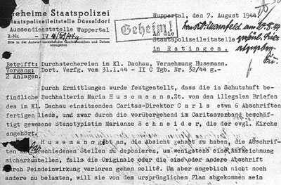„...Weil ich selber durch alle vorgenannten Aktionen sehr stark unter Beobachtung der Gestapo stand, wagte ich es nicht, die inzwischen zahlreich gewordenen Briefe im Caritasbüro oder meiner Privatwohnung zu verstecken. Ich bat Bekannte von mir, die Originale zu übernehmen und sie dann an einem mir unbekannten Ort zu deponieren. So konnte ich jederzeit bei Vernehmungen behaupten, dass ich keine Aufzeichnungen besitze. Am 19.11.1943 bat die Bekannte von mir, die Originale wieder an mich zu nehmen….Wir verabredeten, dass diese am Samstag vor dem ersten Adventssonntag 1943 mir persönlich im Krankenhaus Marienheim ausgehändigt werden sollen. Nie würde ich diese Verabredung getroffen haben, hätte ich auch nur im entferntesten geahnt, welch eine Kette verhängnisvoller Ereignisse damit begann.